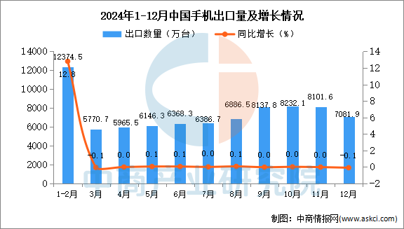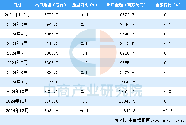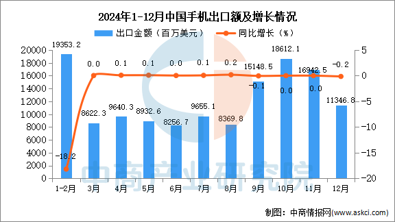 从金额方面来看,2024年12月中国手机出口金额11346。8百万美元,同比下降0。2%;1-12月我国手机累计出口金额134362。5百万美元,同比下降3。1%。